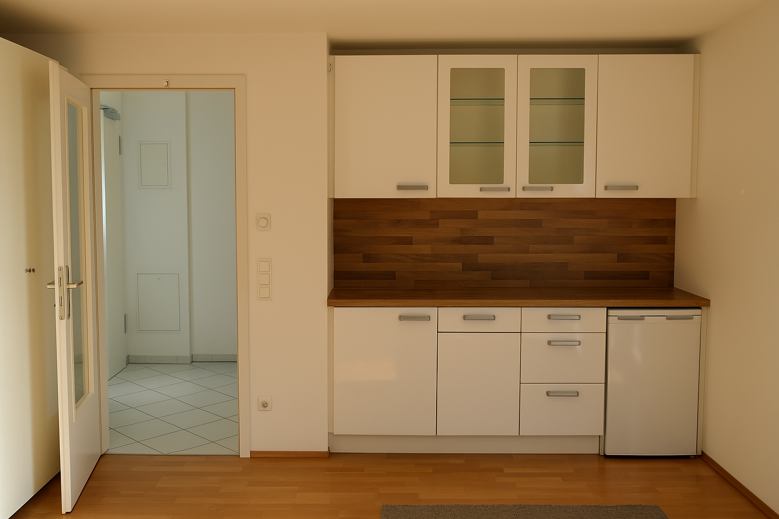 Die ca. 20m² große Wohnfläche bietet Raum zum Kochen, Wohnen und Schlafen. Der offen gestaltete Wohnbereich ist mit einer praktischen Einbauküche ausgestattet und überzeugt durch bodentiefe