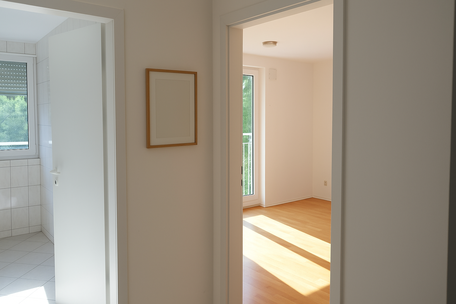 Das Badezimmer ist hell gefliest, verfügt über ein Fenster und ist mit einer Dusche ausgestattet. Eine Diele mit ca. 3,67m² bietet zusätzlichen Platz und führt in eine praktische Nische, die sich ideal für einen Einbauschrank oder eine Garderobe eignet.